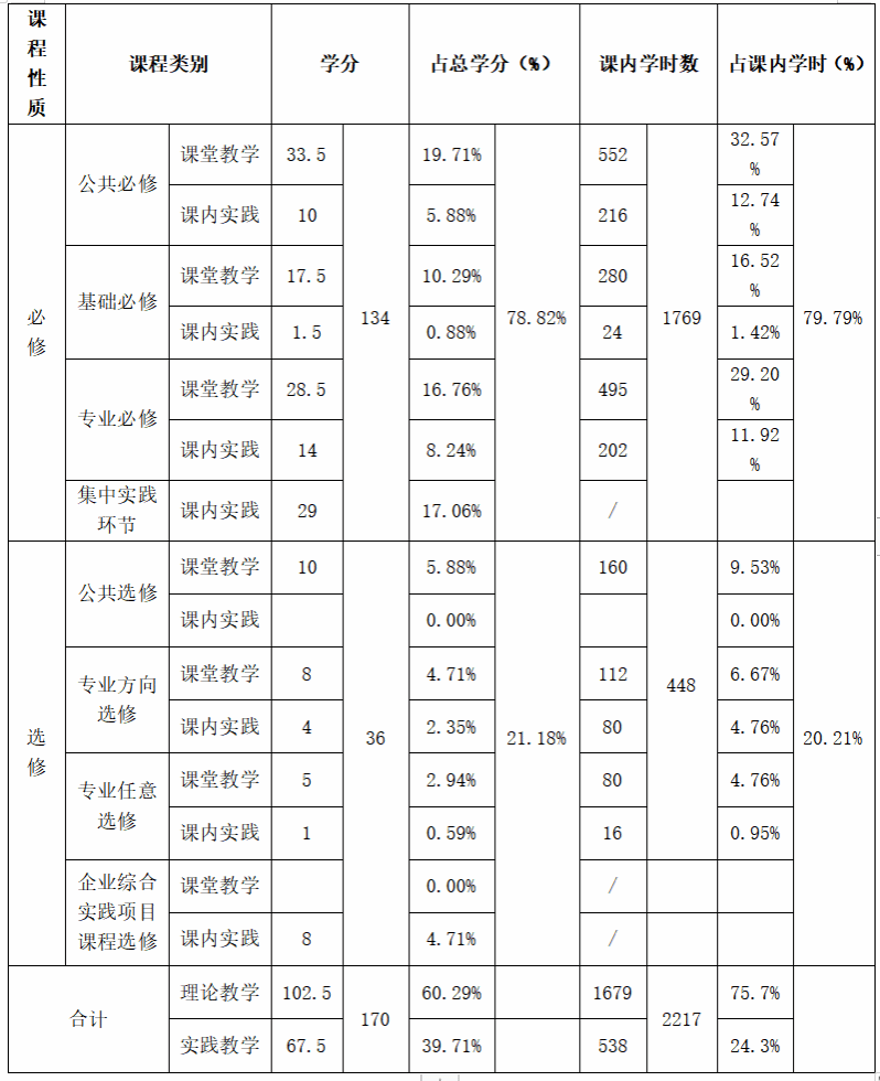 本专业采用校企协同育人“3+1”应用型人才培养模式,学生前三年在学校进行专业知识的学习,最后一年进入企业,在老师指导下进行为期1学年的“企业综合实践项目课程”。学生毕业要求修满170学分,其中校内修满152学分,企业综合实习12分,毕业设计6分。具体情况详见表1。