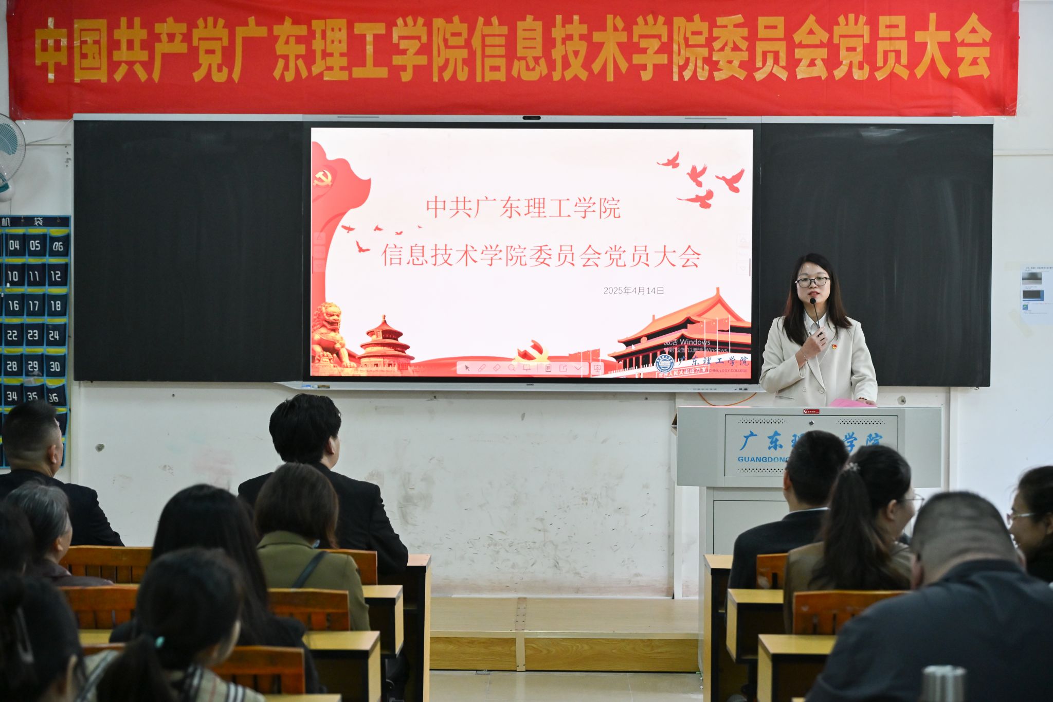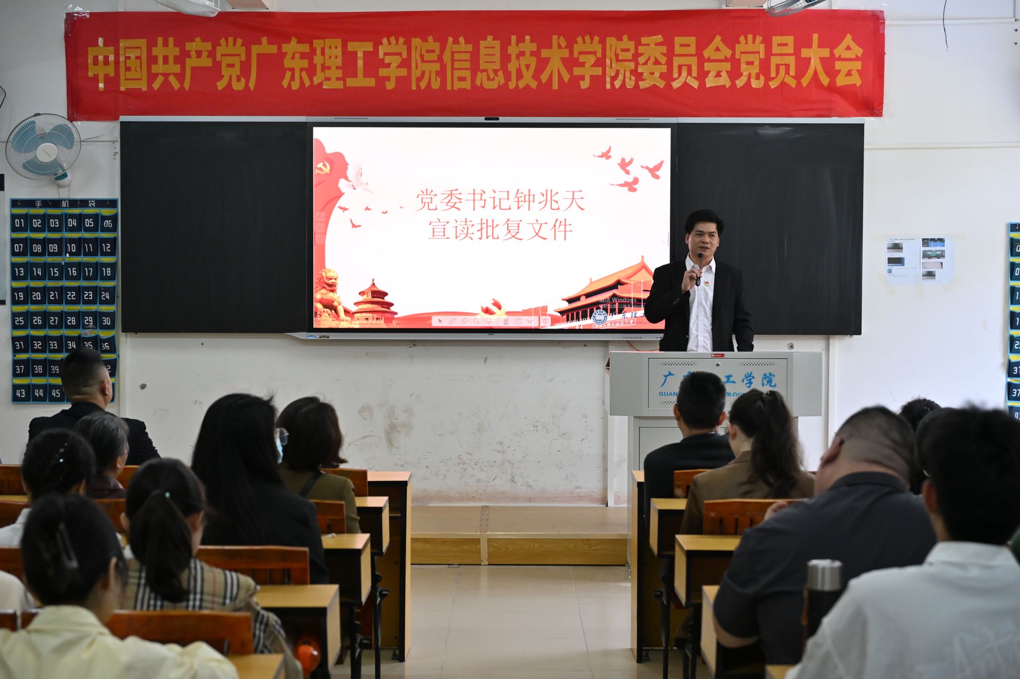 伴随着庄严的国歌旋律,大会隆重启幕。首先,学院党委书记钟兆天代表筹备工作领导小组作了详细的筹备工作报告,汇报了大会前期筹备情况。随后,钟兆天宣读上级党组织关于同意召开本次党员大会的批复文件。