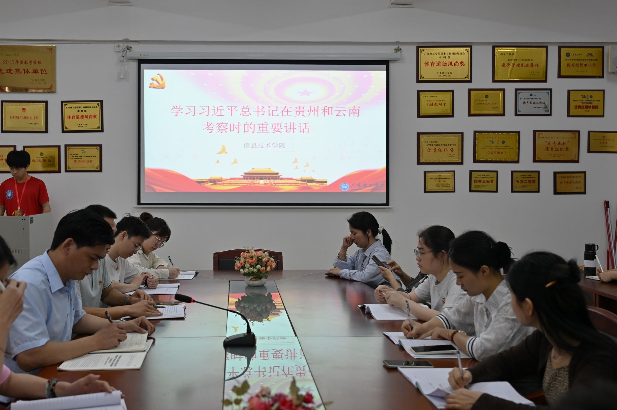 会上,党委纪检委员兼学院副院长徐礼金领学习近平总书记在贵州和云南考察时的重要讲话,指出推动教育事业高质量发展必须毫不动摇地坚持党的领导,不断加强党的建设,推动党员干部增强定力、养成习惯,他强调要把正风肃纪反腐贯通起来,引导广大党员干部自觉遵规守纪,大胆干事创业。