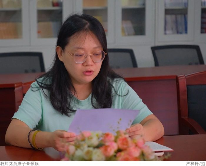 会中,教师党员廉子业领读中国共产党章程,并与其他教师党员一同围绕深入党内法规宣传的工作内容进行讨论。她表示,作为教师党员应大力弘扬伟大建党精神,把遵规守纪的思想自觉化为充满激情、富于创造、勇于担当的实际行动。