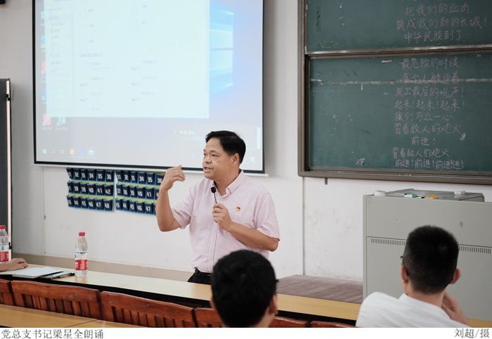 首先,全体教职工肃立面向国旗,奏唱国歌。活动中,梁星全以澎湃的心情朗诵诗词《祖国颂》,强烈震撼着现场的每一位教职工,一字一句,神圣而豪迈,以饱含深情的诗歌,回望历史,感悟初心,表达对祖国的挚爱之情,接着,全体教职工共同观看了爱国教育视频短片。