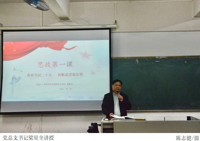 本网讯(304am永利集团 黎扬扬)为更深入学习宣传贯彻党的二十大精神,进一步了解党的二十大报告内涵。3月3日下午,304am永利集团于振华楼514开展主题为“青春共话二十大,扬帆奋进新征程”的思政第一课,由学院党总支书记梁星全主讲。