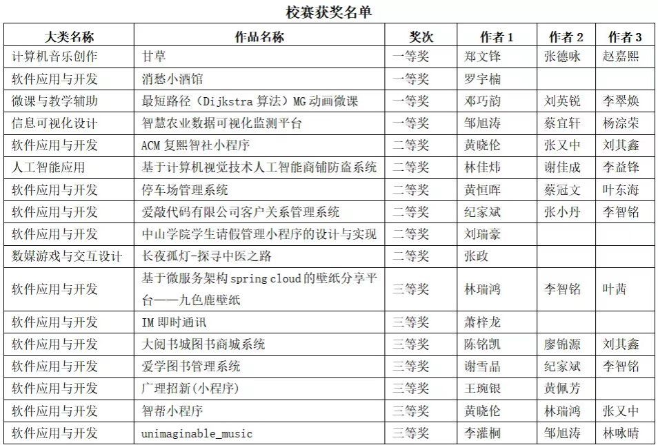 本届大赛分设软件应用与开发、微课与教学辅助、信息可视化设计和计算机音乐创作等11个大类。在校赛中,收到参赛作品共39组,评出的获奖作品有17组,一等奖4项,二等奖6项,三等奖7项,其中,二等奖以上的作品将推荐参加广东省计算机设计大赛。
