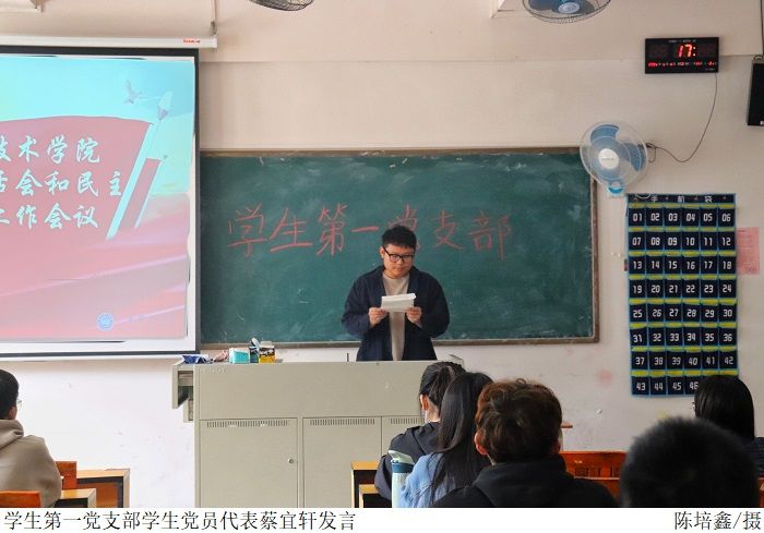 会上,学生第一党支部学生党员代表蔡宜轩就学习方面和思想方面深刻反思自身的问题和不足,并保证在往后的时间里将以严谨、高效的态度和更积极、主动的精神踏实学习,不断提高思想觉悟。