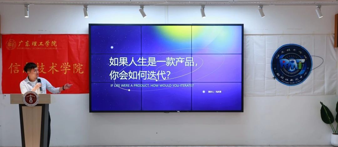 2012级信息管理班冯庆添,现任广东皓兴网络科技联合创始人,以“如果人生是一款产品,你会如何迭代?”为主题分享成长经验。他将大学比作人生首块“产品原型”,强调其探索与奠基作用,提出职场需从“写代码”转向“画蓝图"的思维升级,并指出创业需把自己活成一支队伍,兼具执行、规划与管理能力。