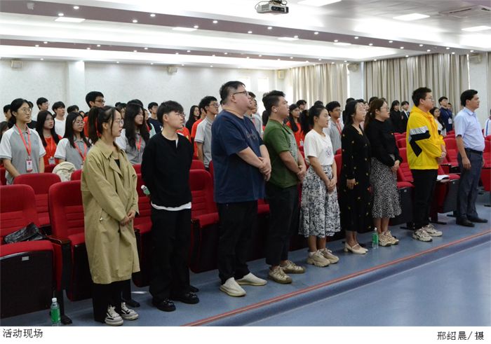 赛前,工作人员提前布置会场并检查设备的状况,随后参赛选手在礼仪的引导下入场准备。活动正式开始,全体人员肃立面向国旗,齐声奏唱国歌。主持人宣布此次比赛的规则和评分细则后,选手们依次上台演讲,他们站在不同的角度阐述自己对立德、修身、普法、守纪的深刻见解,并以严谨的语言论述“立德、修身、普法、守纪”对营造良好学风的重要意义。参赛选手们用他们精彩的演讲呼吁要坚持营造美好的校园风气,引起了台下观众的共鸣。