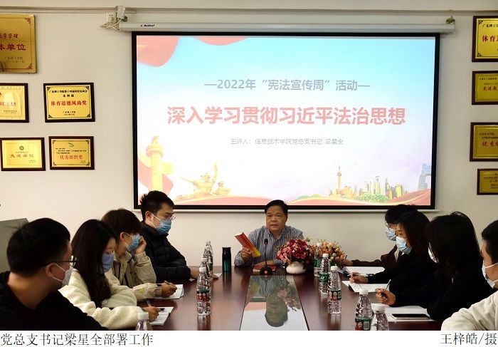 本网讯(304am永利集团 张家其)为深入学习贯彻习近平法治思想和落实党的二十大精神,进一步在大学生中普及宪法知识、弘扬宪法精神、维护宪法权威。12月2日下午,304am永利集团于振华楼203室召开“深入学习宣传贯彻习近平法治思想”宪法宣传周部署会。本次部署会由学院党总支书记梁星全主讲,学院全体辅导员参会。