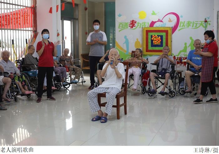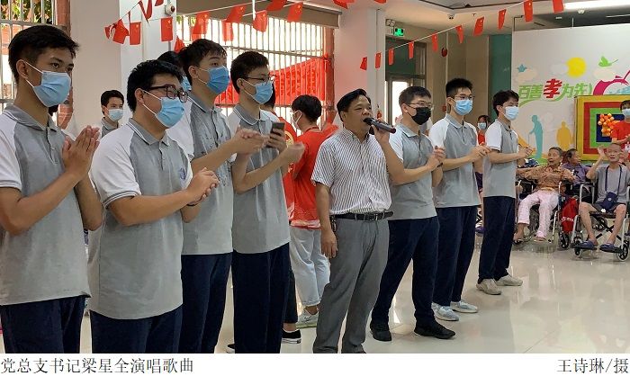 早上八点,全体成员在校门口集合并乘车前往众德养老院。在活动现场,志愿者开始精彩的歌舞表演,梁星全现场演唱歌曲并为爷爷奶奶们送上诚挚的祝福,几位爷爷奶奶在现场也歌唱了《中国人民志愿军战歌》和《我是一个兵》。表演结束后,志愿者在梁星全的带领下为爷爷奶奶送上了毛巾、水果等慰问品。