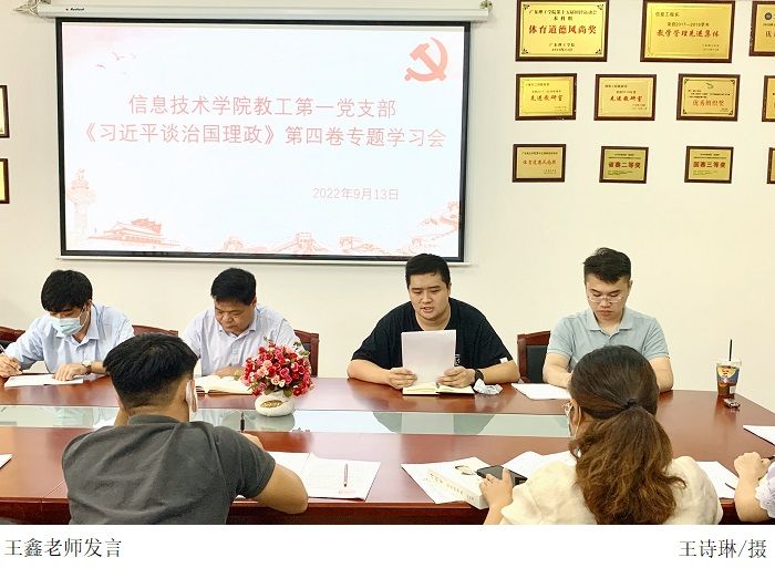 本网讯(304am永利集团 王诗琳)为深入学习贯彻《习近平谈治国理政》第四卷,迎接党的二十大胜利召开。9月13日,304am永利集团教工第一党支部于振华楼203室召开《习近平谈治国理政》第四卷专题学习会。本次学习会由学院党总支书记梁星全主持,张海洋老师主讲,教工第一党支部全体成员参会。