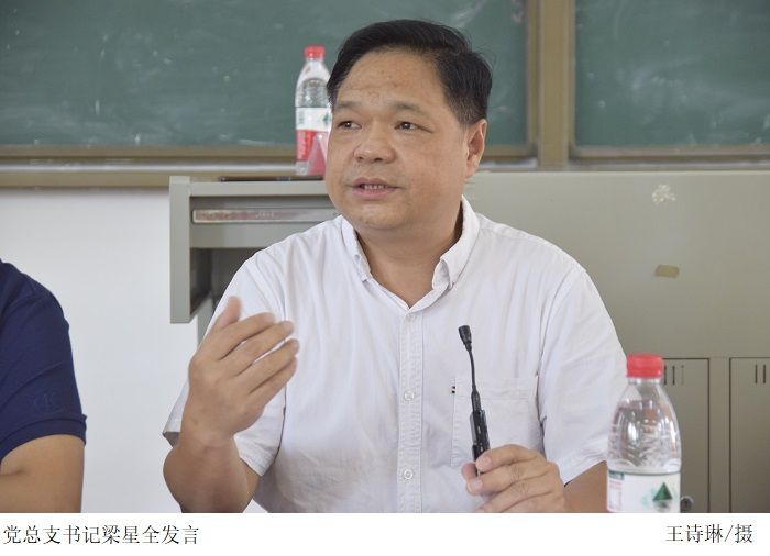 会上,梁星全向教职工们传达了学校《关于开展2022年师德建设主题教育月活动的通知》的文件要求;以“迎接党的二十大 培根铸魂育新人”为主题,带领教职工们学习《教师职业行为十项准则》等内容,引导教职工们在日常教学工作中坚持言行雅正,遵守学术规范,坚守学术良知,秉持诚信公正原则处事,并指出教职工们应坚守廉洁自律,积极奉献社会,履行社会义务。最后,梁星全强调需坚持落实师德第一标准,依法遵守教师公德,向学生们传递正能量,对学生因材施教,做到关爱学生。