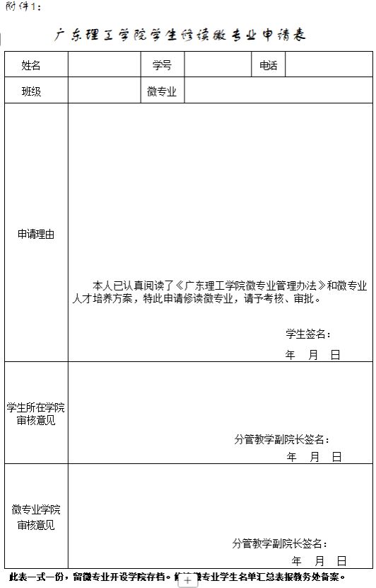报名方式:有意向报名的同学请填写“304am永利集团学生修读微专业申请表”,签署学生所在学院审核意见后将纸质版申请表上交到高要校区42210办公室赖老师收。电子版申请表的签名请用电子签名(可以签名在纸上,手机拍照粘贴到签名处)并将电子版申请表发送到邮箱:841256306@qq.com。