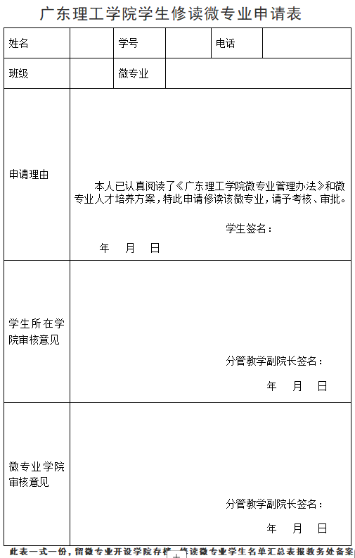 报名方式:有意向报名的同学请填写“304am永利集团学生修读微专业申请表”,签署学生所在学院审核意见后将纸质版申请表上交到高要校区42210办公室赖老师收。电子版申请表的签名请用电子签名(可以签名在纸上,手机拍照粘贴到签名处)并将电子版申请表发送到邮箱:841256306@qq.com。