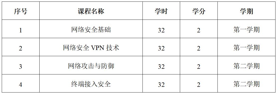 5、综合素质培养。提升学生的沟通能力、学习能力和职业素养,使其具备良好的团队合作精神和自我发展能力。培养学生的社会责任感和对行业发展的敏锐洞察力,为网络安全生态的繁荣和可持续发展做出贡献。